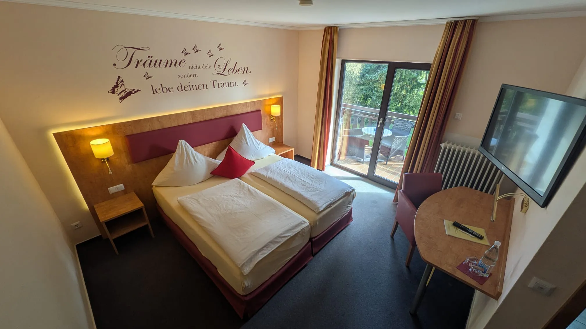 La chambre standard au rez-de-chaussée dispose d'une télévision par satellite, d'une salle de bains privative et d'un bureau. Il est situé dans la maison principale. Les chambres sont construites dans la pente. La vue depuis la fenêtre est de pierres plantées.